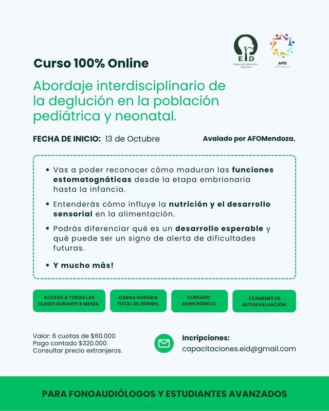 Es una formación destinada a fonoaudiólogos y logopedas que quieran adquirir conocimientos del abordaje interdisciplinario en relación a la deglución.
